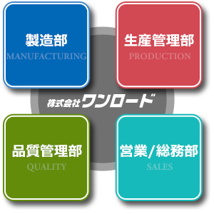 ワンロードを支える各部署、「製造部」「生産管理部」「品質管理部」「営業部・総務部」のご紹介です。